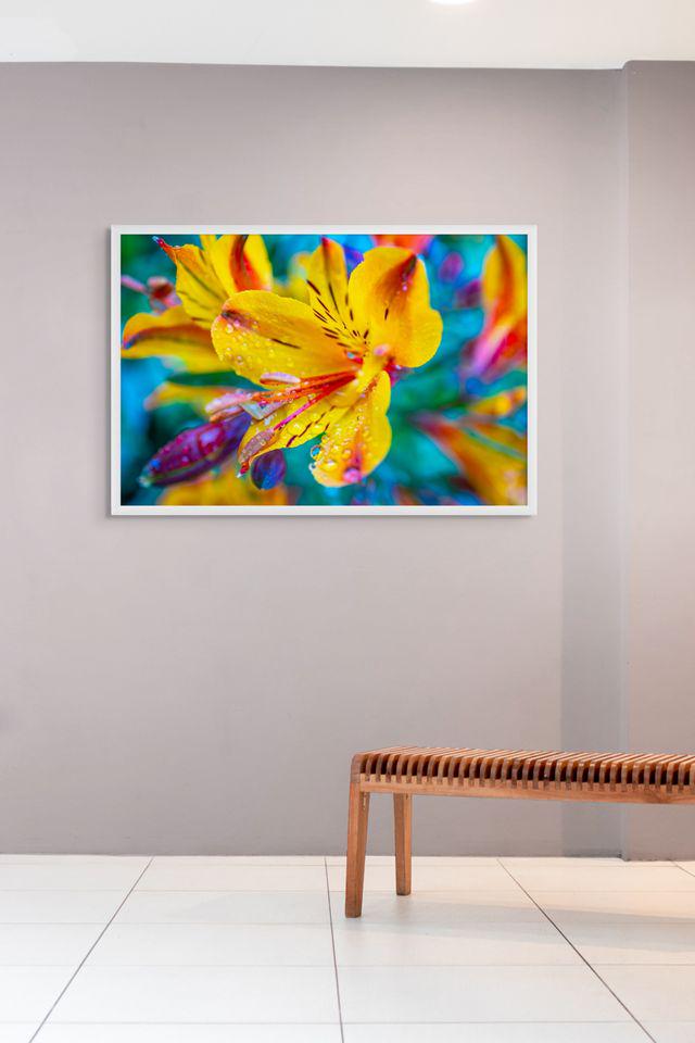 Striking photo of a vibrant yellow and red St. Martin’s lily touched with fresh raindrops,